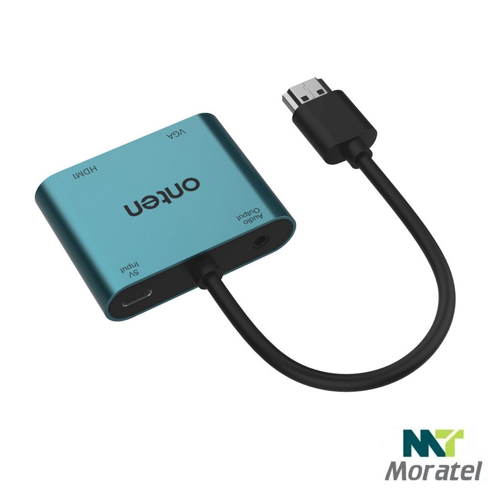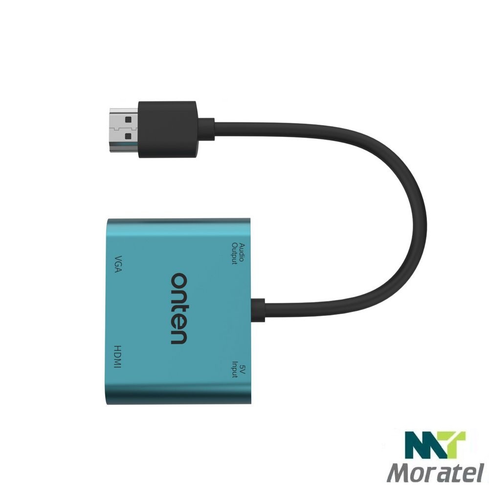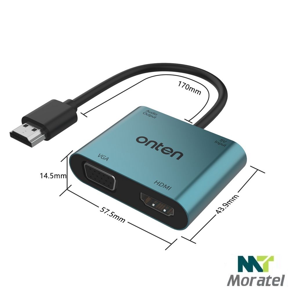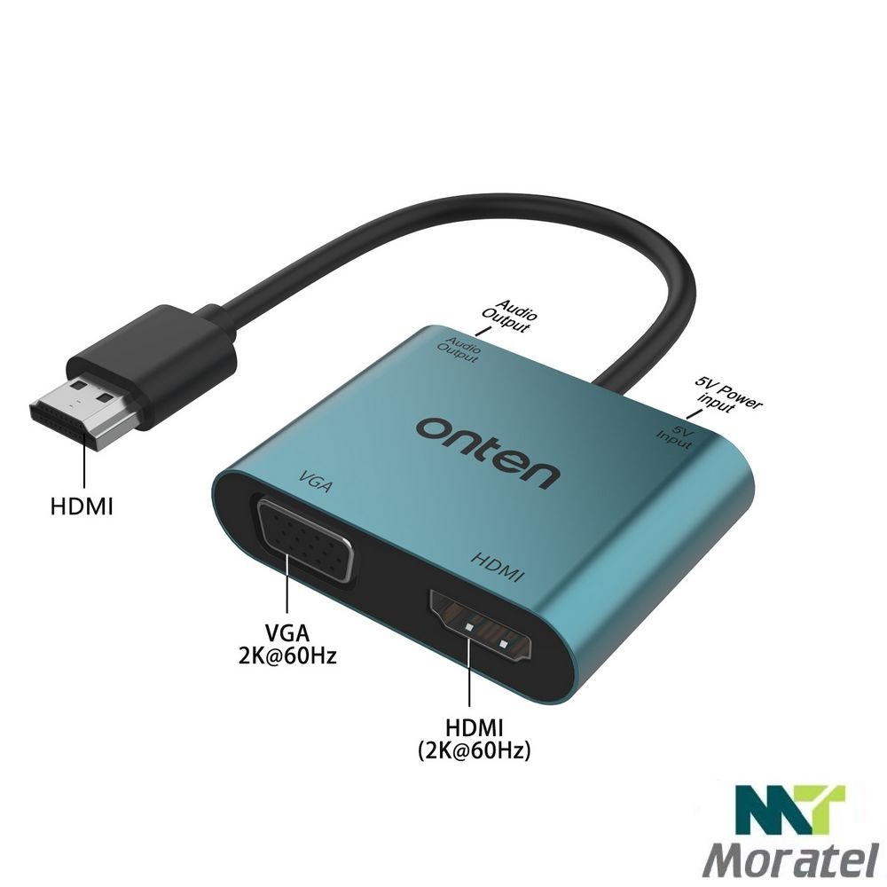 مبدل HDMI به HDMI + VGA مدل 5166HV از برند Onten، یک راهکار حرفه‌ای برای انتقال همزمان سیگنال‌های تصویری HDMI از کامپیوتر یا لپ‌تاپ به تلویزیون‌های HDTV یا پروژکتورها است. این دستگاه امکان خروجی همزمان تصویر با کیفیت تا رزولوشن 2K@60Hz را روی هر دو پورت HDMI و VGA فراهم می‌کند. همچنین دارای خروجی صوتی جداگانه از طریق جک 3.5 میلی‌متری است که امکان اتصال به سیستم‌های صوتی مستقل را فراهم می‌کند.